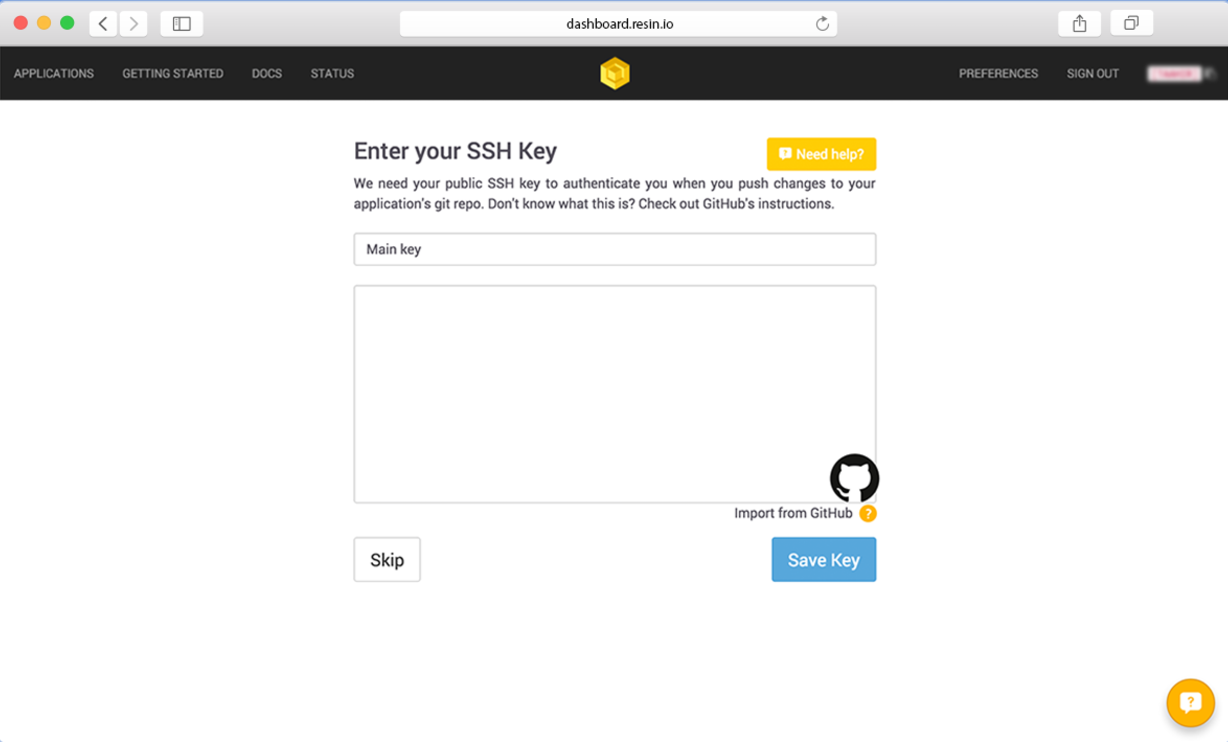 Now we need to go back to our Resin dashboard. Go to "preferences" and then "ssh-keys". From there, click ssh-keys and add the public ssh-key from the pair we generated into Resin.io.